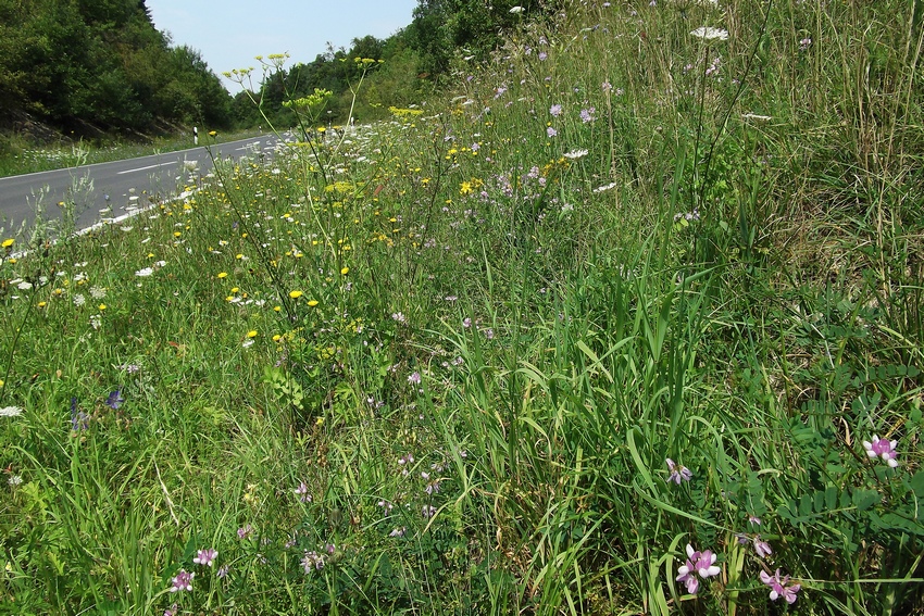 Charakteristisches (Larval-)Habitat des Veränderlichen Widderchens im Tauberland, eine sporadisch gemähte Straßenböschung mit Bunter Kronwicke.