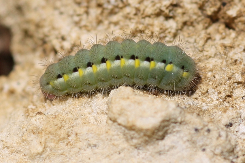 Larve des Bergkronwicken-Widderchens in Aufsicht am Albtrauf (Hülben), Mai 2013.