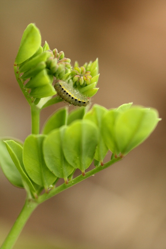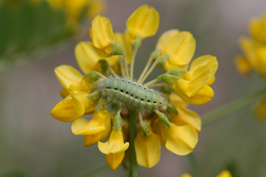 Am Blütenstand ruhende Larve des Bergkronwicken-Widderchens am Albtrauf (Öschingen), Mai 2013.