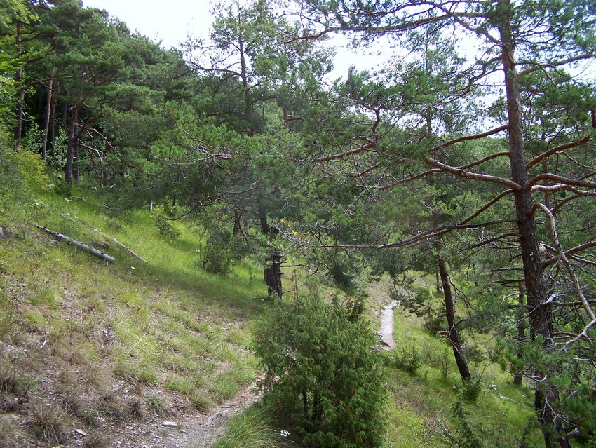 (Larval-)Habitat des Bergkronwicken-Widderchens am Albtrauf (Öschingen), ein steiler, lichter und südexponierter Steppenheidewald.