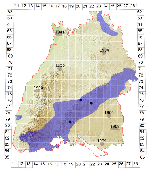 Grauer Bereich: Ehemalige Vorkommen (letztes Nachweisdatum)