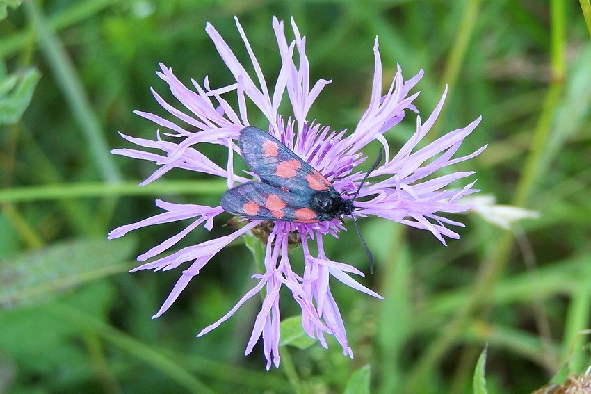 Kleines Fünffleck-Widderchen (Zygaena viciae) auf einer trockenen Magerwiese im Albvorland (NSG Schaichtal), Juni 2008.