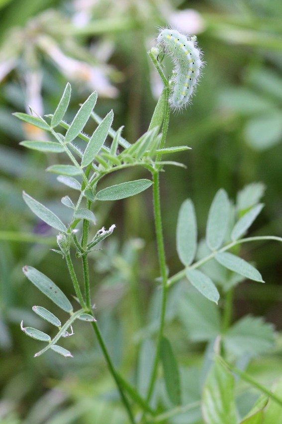 Larve von Z. viciae auf der bevorzugten Wirtspflanze, der Wiesenplatterbse (Lathyrus pratensis), Juni 2010.